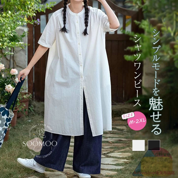シャツワンピース 半袖 チュニックワンピース レディース 春夏 バンドカラー ロングワンピース 前開き 重ね着 クルーネック ミモレ丈 ゆったり 綿 コットン ワンピース キレイめ