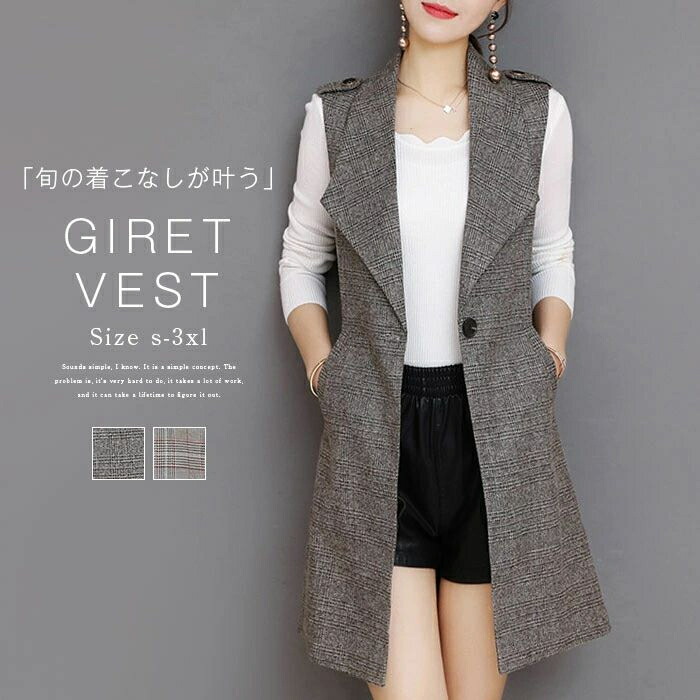 ロングベスト ジレ レディース チェック ベスト ロング丈 春 秋 ノースリーブ ロングジレ チェック柄 ジレンチ トップス 春秋 大きいサイズ シンプル Iライン オフィ ゆったり