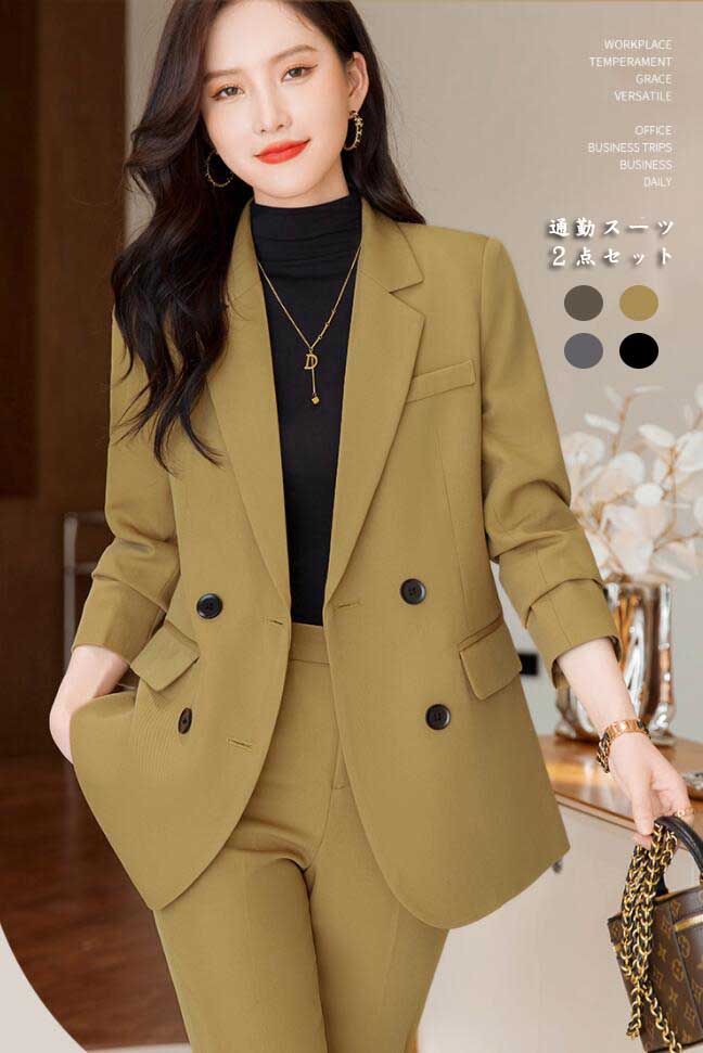 レディーススーツセット 上下セット 2点セット ジャケット+パンツ パンツスーツ カジュアル 通勤スーツ ビジネス 高級感 上品 キレイめ 4色 ダブルブレスト スリム 女性 就職活動 面接 お ママ