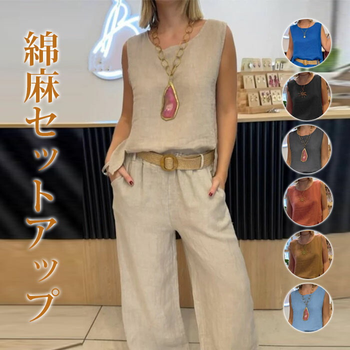 セットアップ レディース パンツドレス 綿麻風 パンツスーツ ノースリーブ 春夏 夏 無地 女の子 日常デート 通勤 卒業式 ガウチョパンツ ワイドパンツ 体型カバー 脚長効果 欧米風 カジ ゆったり